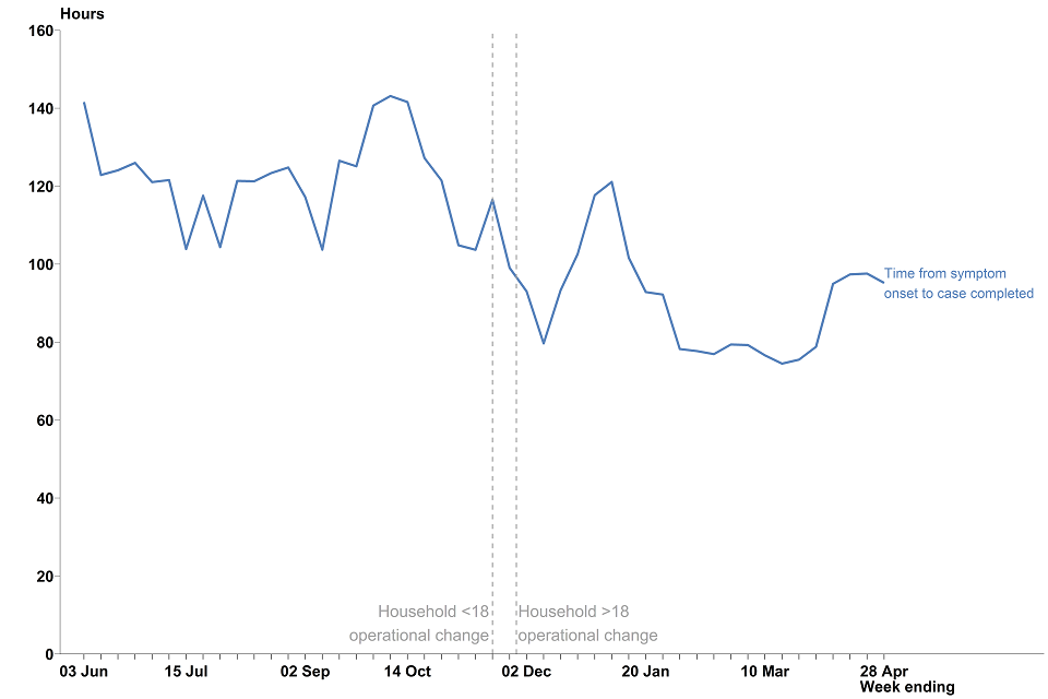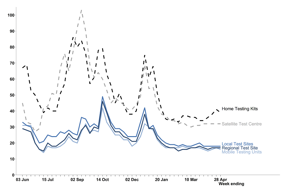 Turnaround times for satellite tests are now consistently lower than what was observed before this increase in December 2020. Turnaround times for home tests have increased overall from the week ending 31 March, however, have fallen slightly in the most recent week compared to the previous week.