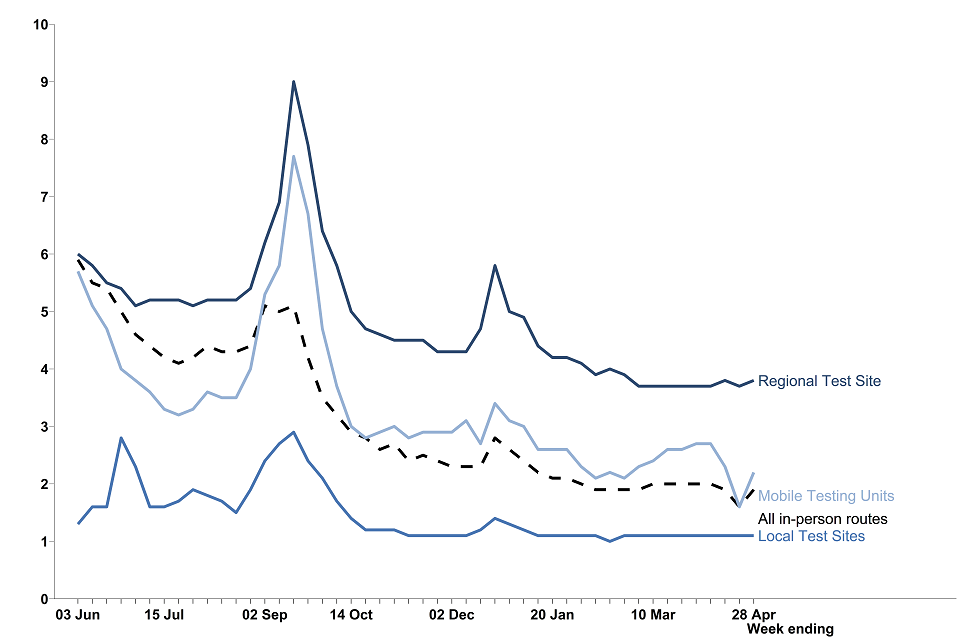Between 22 April and 28 April 2021, 97.2% of pillar 1 test results were made available within 24 hours. Turnaround times for pillar 1 have been above 95% since the week ending 27 January. Since reporting began, 88.0% of test results have been made available within 24 hours.