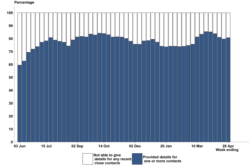 Of the cases transferred to the contact tracing system between 22 April and 28 April 2021, 89.8% were reached and asked to provide information about their recent close contacts. This has remained broadly consistent since November 2020.