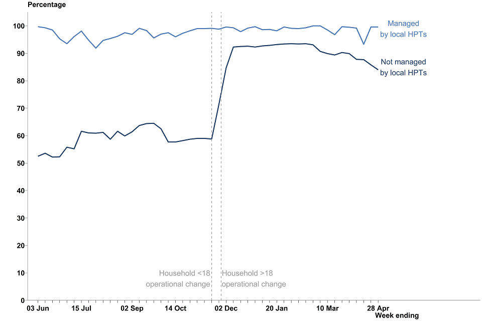 If NHS Test and Trace is not able to reach an individual testing positive or if no communication details are available, then it is not always possible to know if the case should be managed by a local HPT or not. Therefore, these breakdowns are not available. ↩