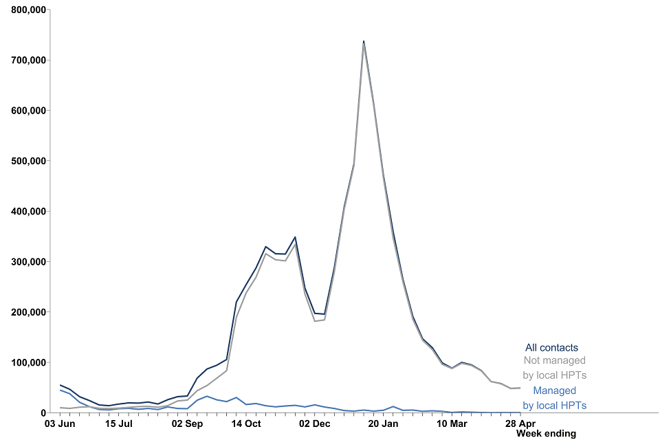 Between 22 April and 28 April, 49,151 people[footnote 2] were identified as coming into close contact with someone who had tested positive. The number of close contacts identified has increased in the latest week.