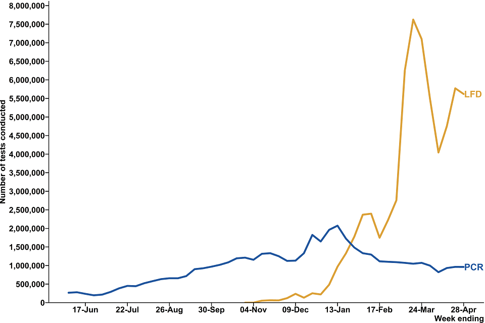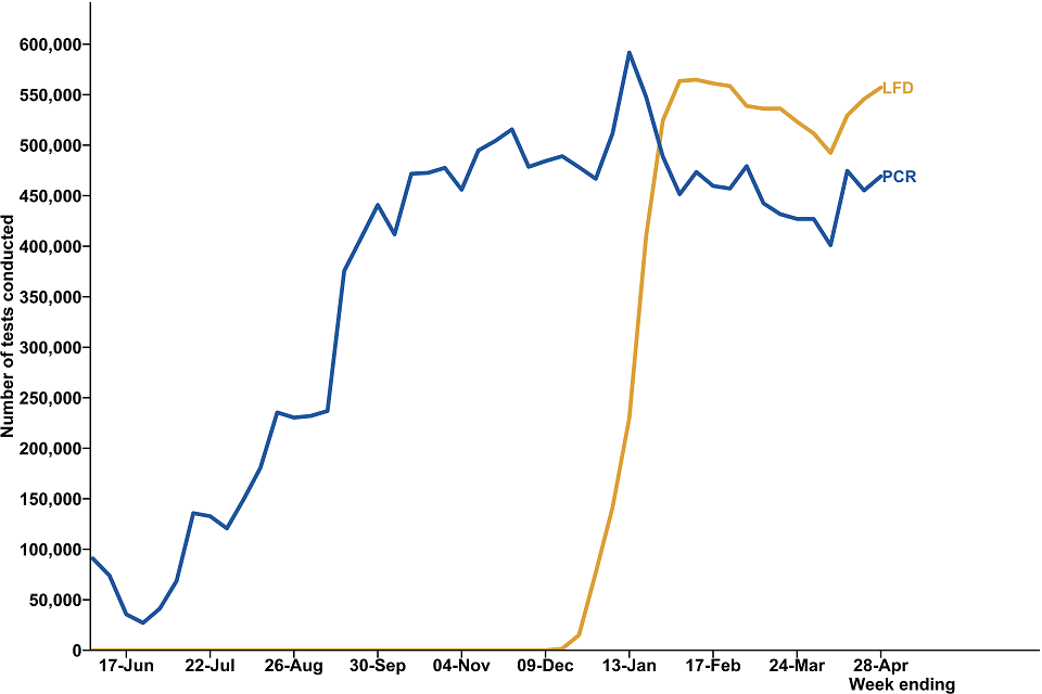 PCR and LFD tests have different uses and are therefore applied in different situations (see the ‘Types of tests’ section above for more information). The primary purpose of rapid LFD testing is to identify people with COVID-19 who do not have symptoms. As the number of LFD tests conducted increases, more asymptomatic positive cases are identified earlier and therefore they are less likely to transmit the virus to their contacts.