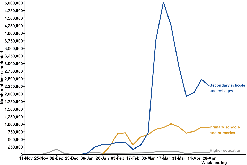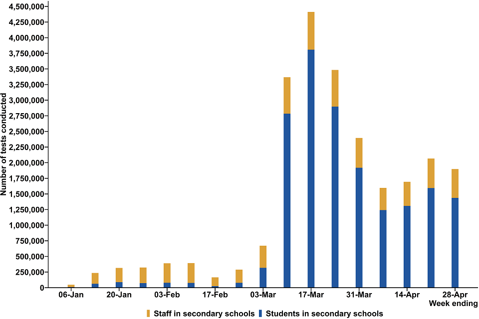 In the latest week ending 28 April, 1,436,631 LFD tests were taken by students in secondary schools which is a slight decrease from 1,593,990 tests in the previous week.