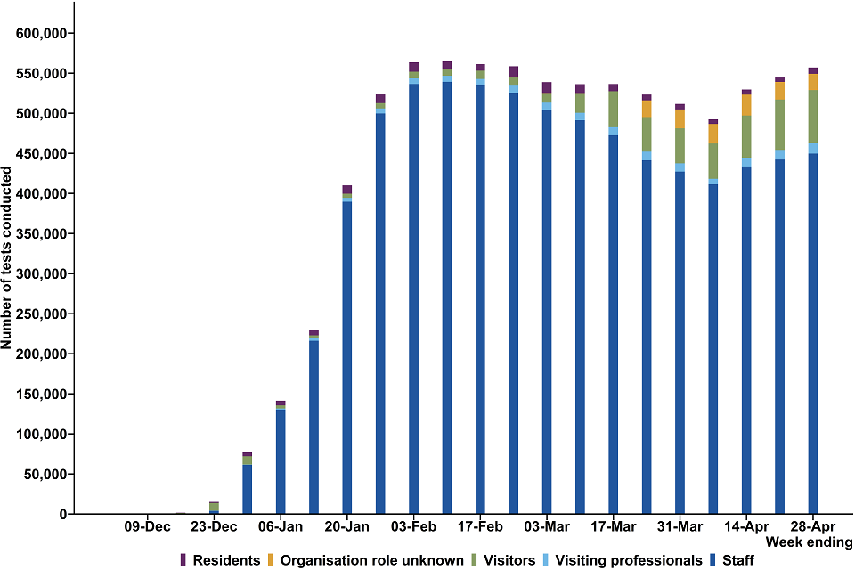 The number of PCR tests conducted within care homes increased overall from 40,000 tests in the week commencing 25 June 2020 to over 590,000 tests in the week commencing 7 January 2021. There has been an increase in the latest week (22 to 28 April) to 469,242, from 455,172 in the previous week (15 to 22 April).