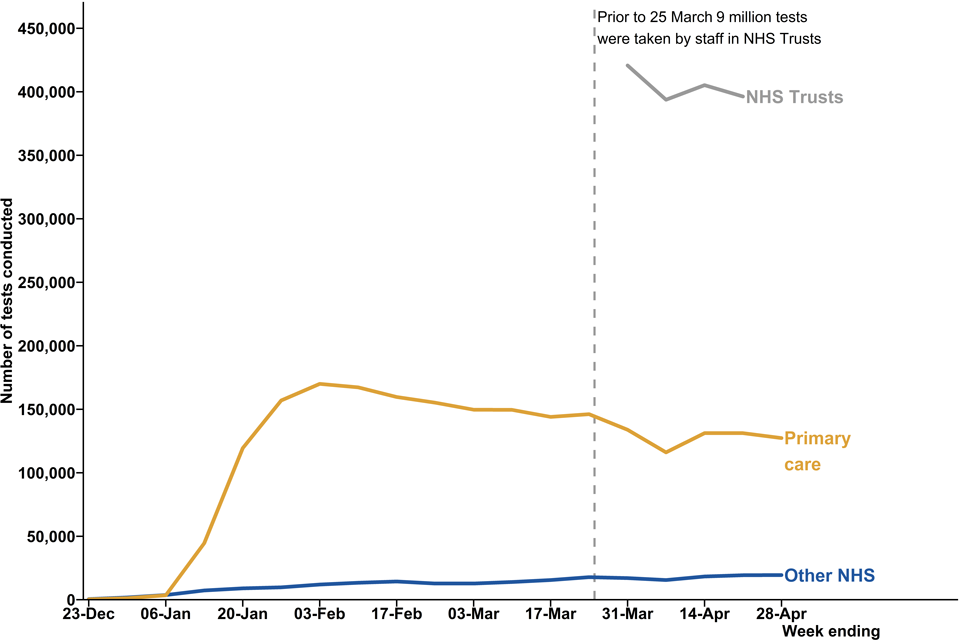 The majority of tests reported by other NHS staff, include members of staff working in the independent sector who have also had access to twice weekly LFD testing. In the latest week ending 28 April, 19,431 tests were conducted by other NHS employees which is a slight increase from 19,317 tests in the previous week and 16 positive test results were received.