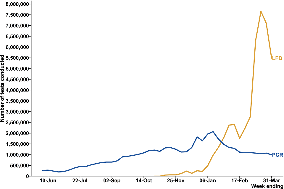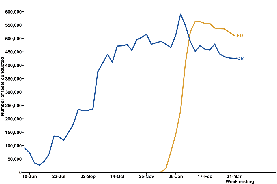 The week commencing the 25 March 2021 was the tenth successive week for which more LFD tests were conducted than PCR tests. Previously the number of PCR tests conducted had always been higher than LFD tests. This reflects the increasing use of LFD tests, as well as a decrease in symptomatic people taking a PCR test due to decreasing COVID-19 prevalence.