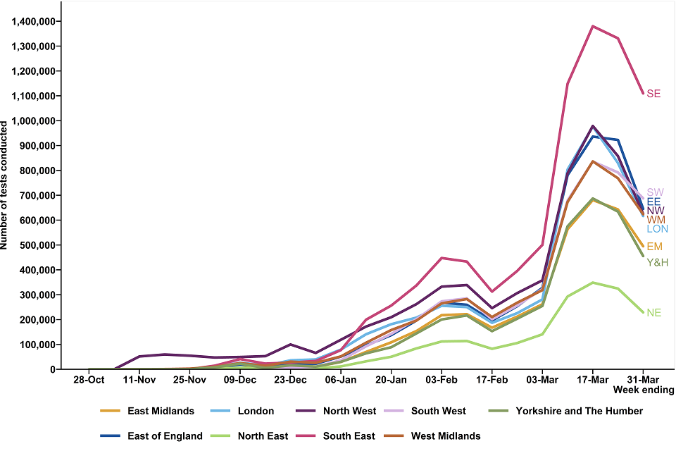 The number of LFD tests conducted has decreased across all regions in the latest week which coincides with the end of the spring term for schools. This follows a peak in the number of LFD tests between 11 March and 17 March which coincided with return of secondary students to school. Between 25 March and 31 March 2021, the most LFD tests were conducted in the South East followed by the South West.