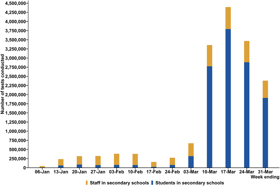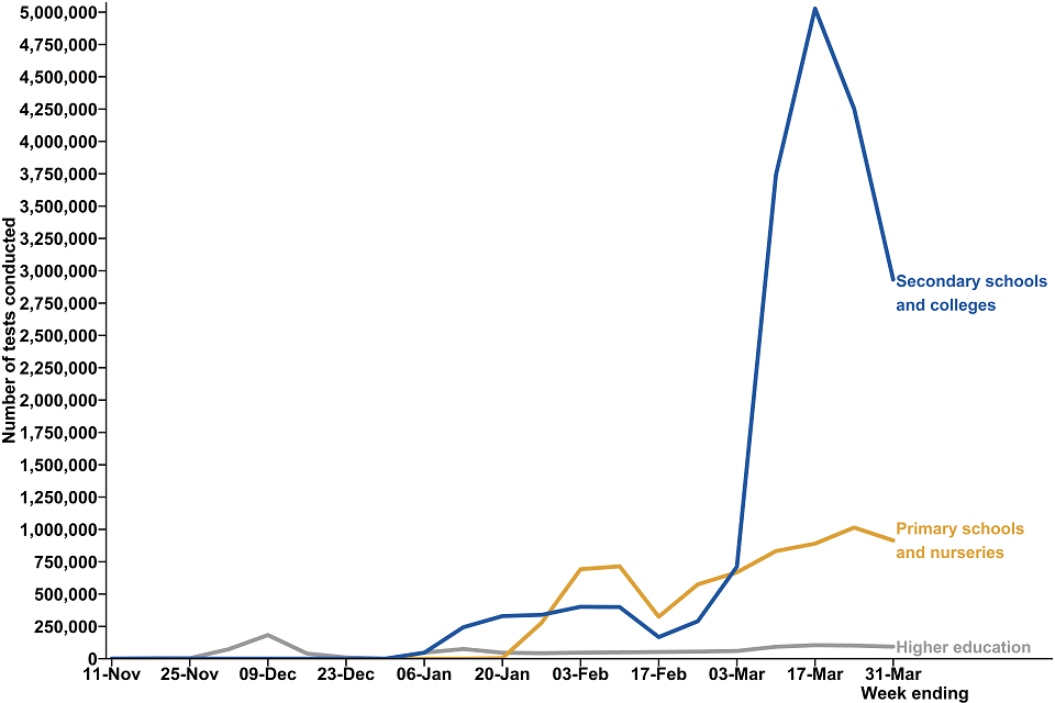 In the latest week, 1,908,916 tests were taken by students in secondary schools. This is a decrease since the week commencing 11 March, when the number of tests for students in secondary schools peaked. The peak coincided with students each completing 3 tests on their return to school, which has shifted to twice-weekly home-testing in the latest week followed by the end of the spring term.