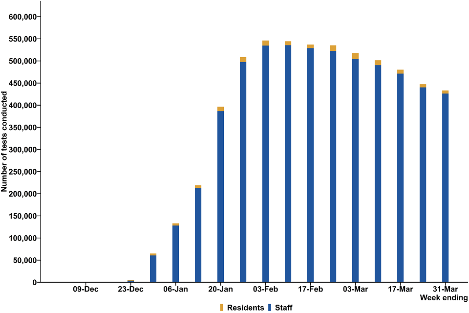 The number of PCR tests conducted within care homes increased overall from 40,000 tests in the week commencing 25 June 2020 to over 550,000 tests in the week commencing 7 January 2021. This has decreased across the last 2 months to 425,792 tests in the latest week (25 to 31 March 2021) as prevalence and the number of outbreaks has reduced.
