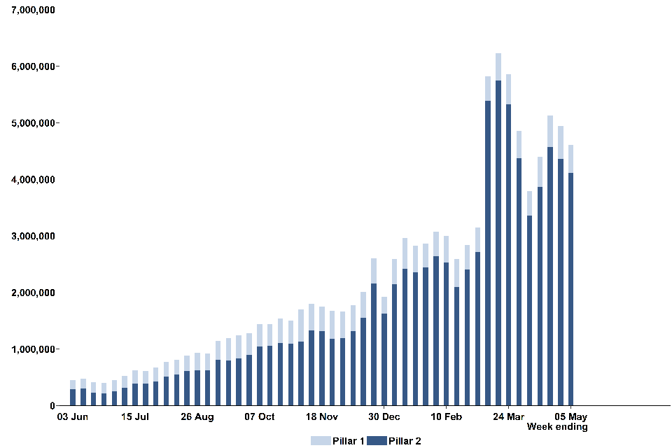Between 29 April and 5 May 2021, 4,607,702 people were tested for coronavirus (COVID-19) at least once,[footnote 5] a 7% decrease compared to the previous week.
