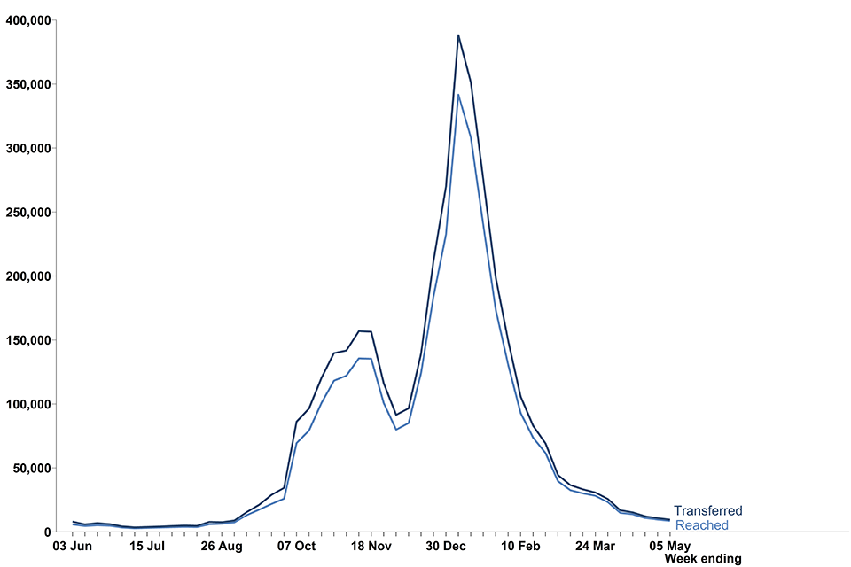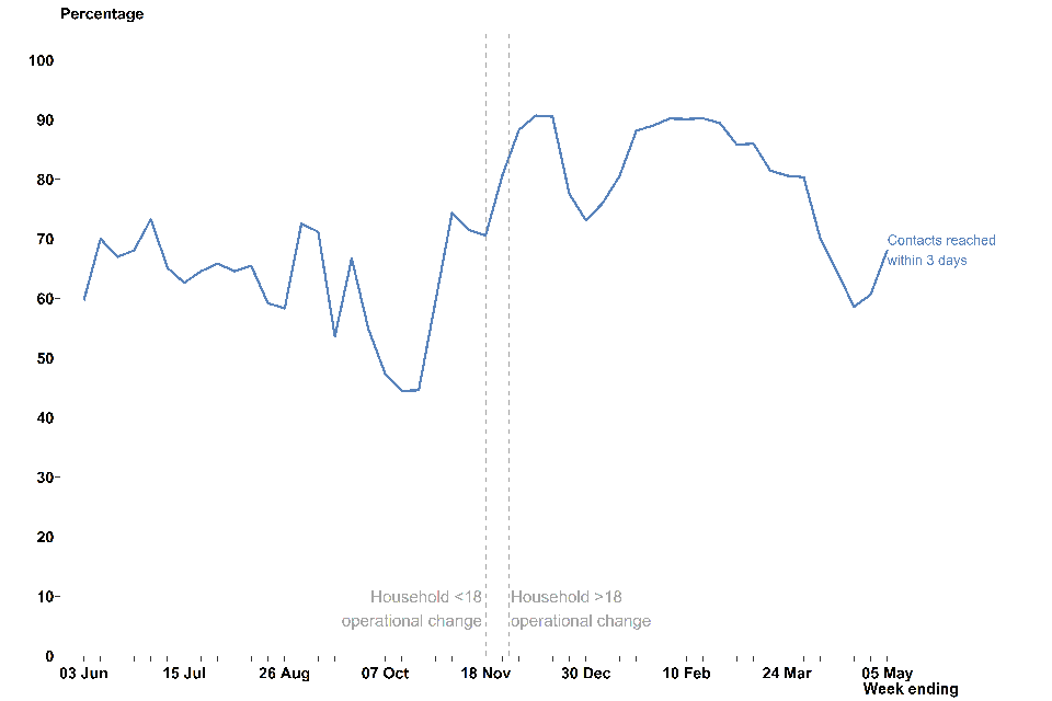 Of the cases transferred to the contact tracing system between 29 April and 5 May 2021, 90.7% were reached and asked to provide information about their recent close contacts. This has remained broadly consistent since November 2020.