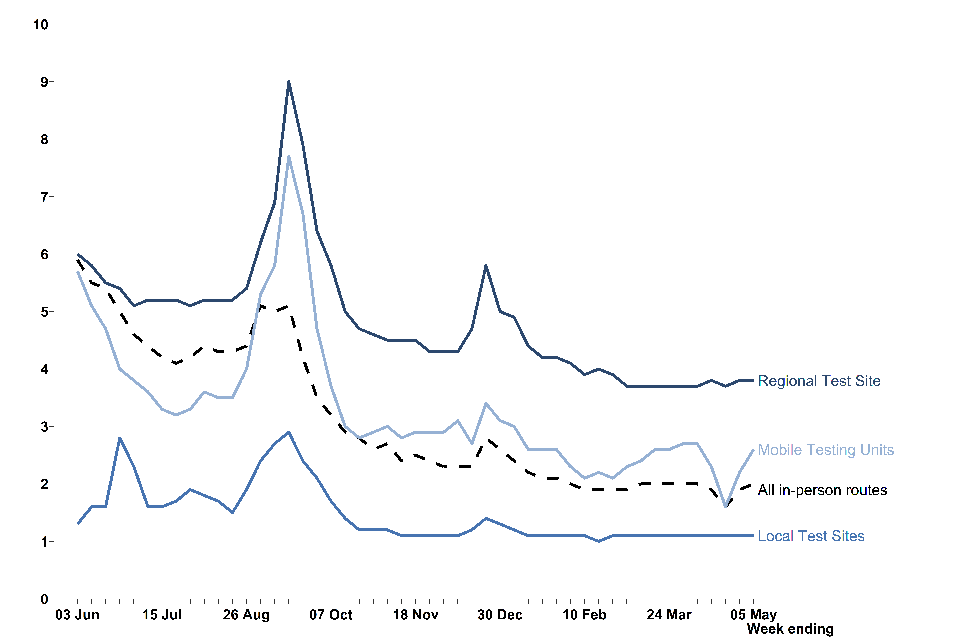 Turnaround times for pillar 2 (virus testing for the wider population) for all in-person testing routes have become shorter overall since the beginning of December 2020. In the most recent week, 90.1% of in-person tests were received within 24 hours compared to 89.0% in the previous week.