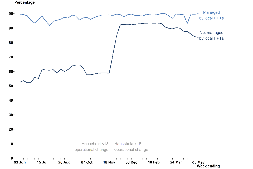 If NHS Test and Trace is not able to reach an individual testing positive or if no communication details are available, then it is not always possible to know if the case should be managed by a local HPT or not. Therefore, these breakdowns are not available. ↩