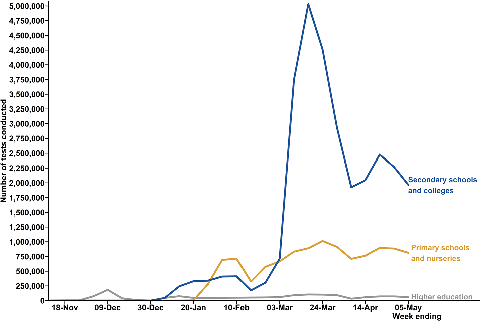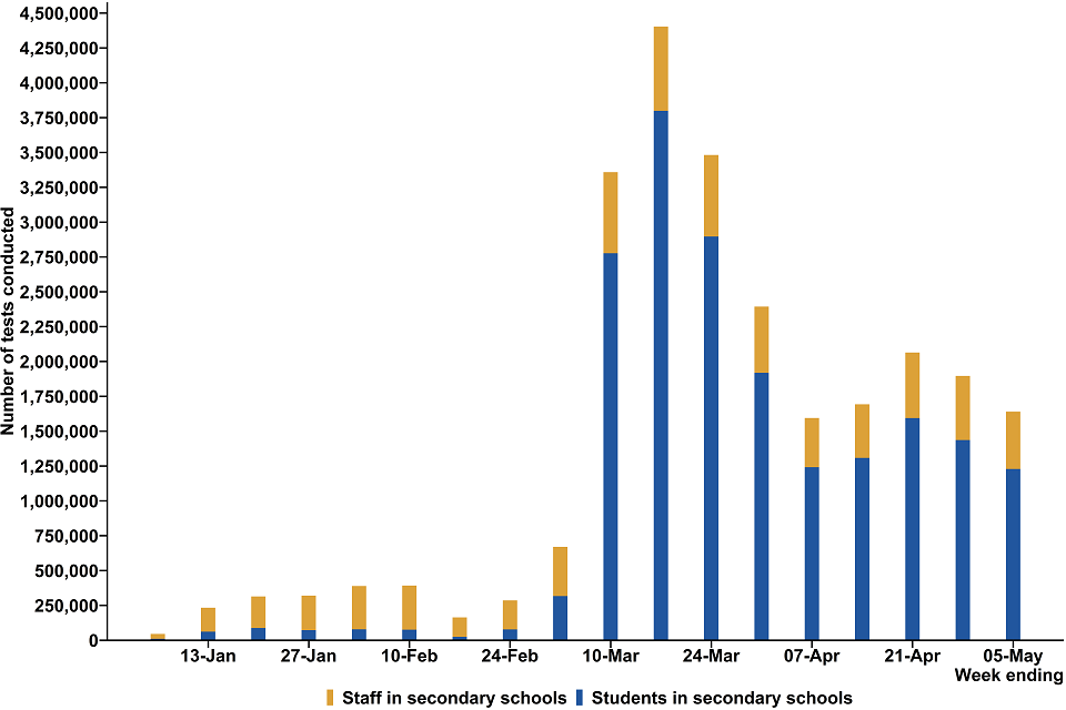In the latest week ending 5 May, 1,228,727 LFD tests were taken by students in secondary schools which is a decrease from 1,436,448 tests in the previous week.