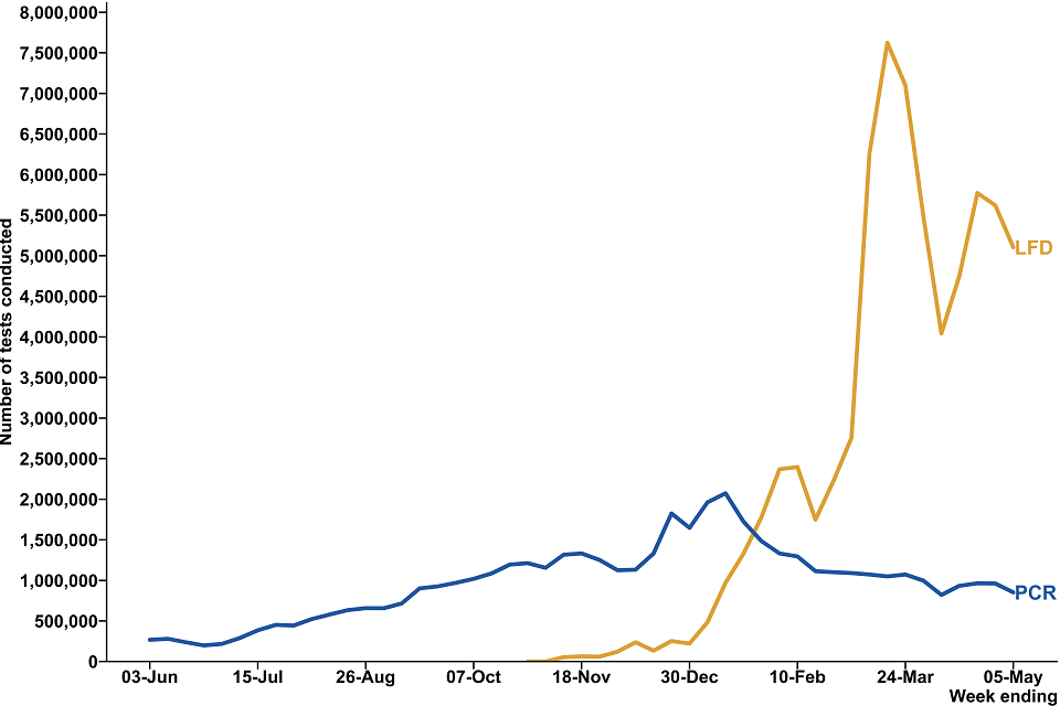 Of the LFD tests conducted in the latest week (29 April to 5 May), 344 tests returned a positive result, and 492,700 tests returned a negative result. Since LFD tests were introduced, 22,860 positive results and 8,885,797 negative results have been reported.