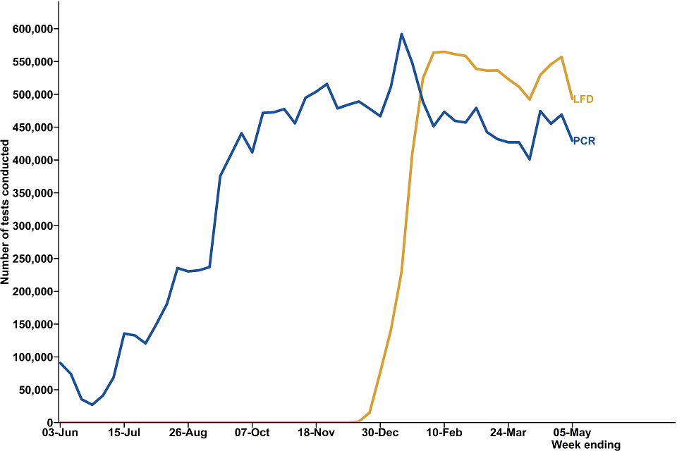 In comparison, 852,503 PCR tests were conducted in the latest week (29 April to 5 May 2021). The number of PCR tests conducted continues to be lower than the number of LFD tests conducted. This reflects the increasing use of LFD tests, as well as a decrease in symptomatic people taking a PCR test due to decreasing COVID-19 prevalence.