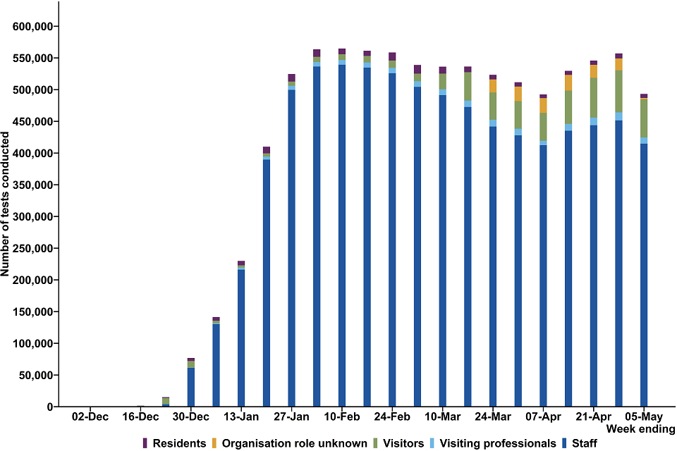 The number of PCR tests conducted within care homes increased overall from 40,000 tests in the week commencing 25 June 2020 to over 590,000 tests in the week commencing 7 January 2021. There has been a decrease in the latest week (29 April to 5 May) to 429,551, from 469,242 in the previous week (22 to 28 April).