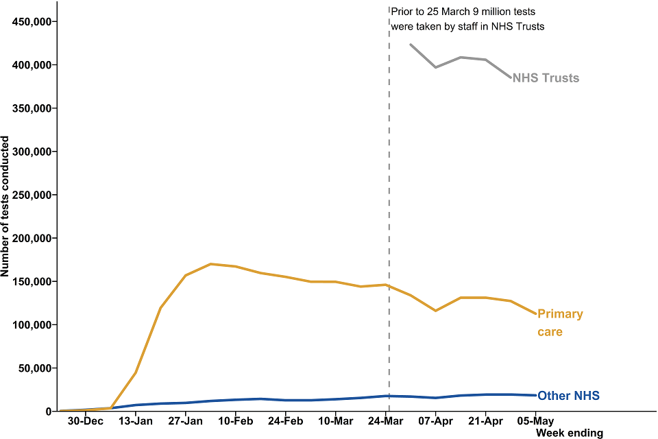 Within the NHS the majority of staff work in NHS trusts, followed by primary care and then the independent sector, hence testing volumes will reflect the number of staff working in each setting.