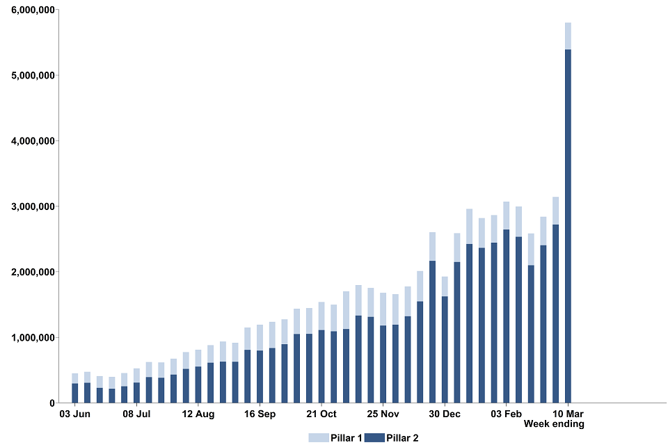 Between 4 March and 10 March, 5,801,738 people were tested for coronavirus (COVID-19) at least once in the reporting week[footnote 4], an 85% increase compared to the previous week.