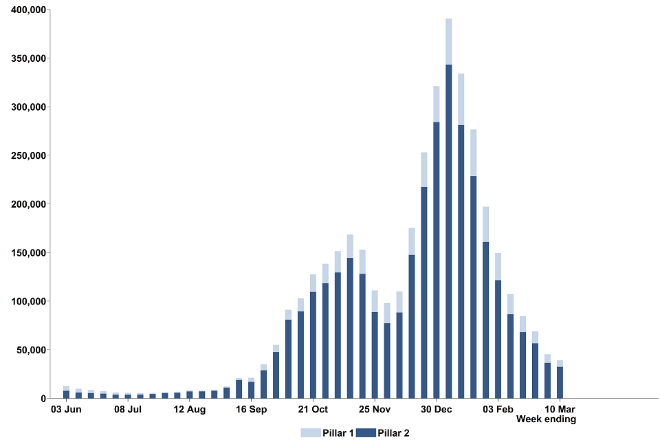 39,118 people tested positive for coronavirus (COVID-19) at least once[footnote 1] in England between 4 March and 10 March 2021, a 14% decrease compared to the previous week. This continues the decrease in positive cases observed over the last 9 weeks.