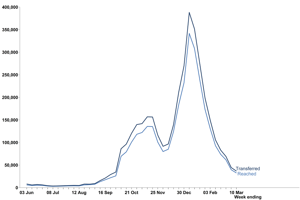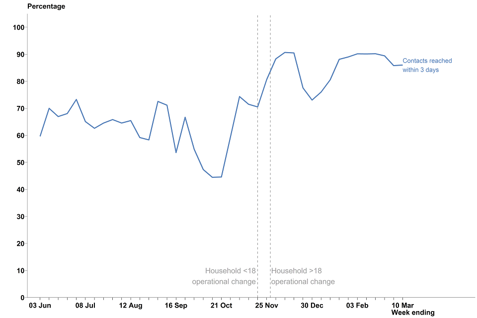 The percentage reached within 3 days gradually increased between October 2020 and early December 2020, with 90.7% successfully reached in the week ending 9 December. There was a dip over the Christmas period, but the percentage returned to similar levels by the end of January 2021.