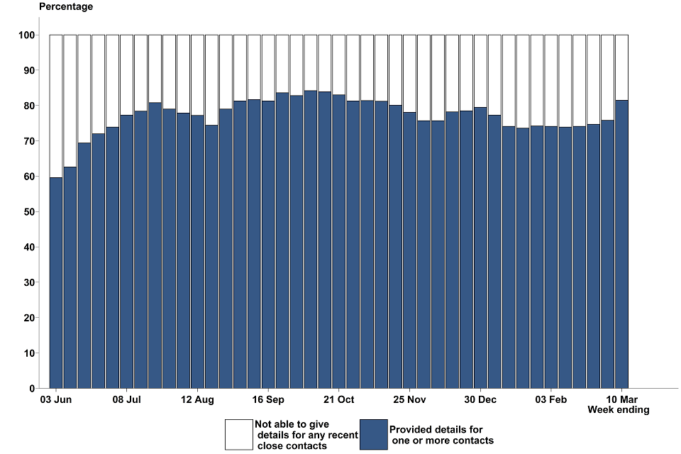 Of the cases transferred to the contact tracing system between 4 March and 10 March, 88.6% were reached and asked to provide information about their recent close contacts. This has remained broadly consistent over the past 4 months.