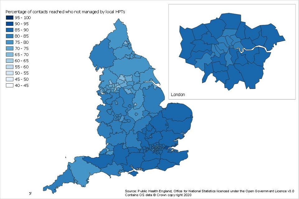 If NHS Test and Trace is not able to reach an individual testing positive or if no communication details are available, then it is not always possible to know if the case should be managed by a local HPT or not. Therefore, these breakdowns are not available. ↩