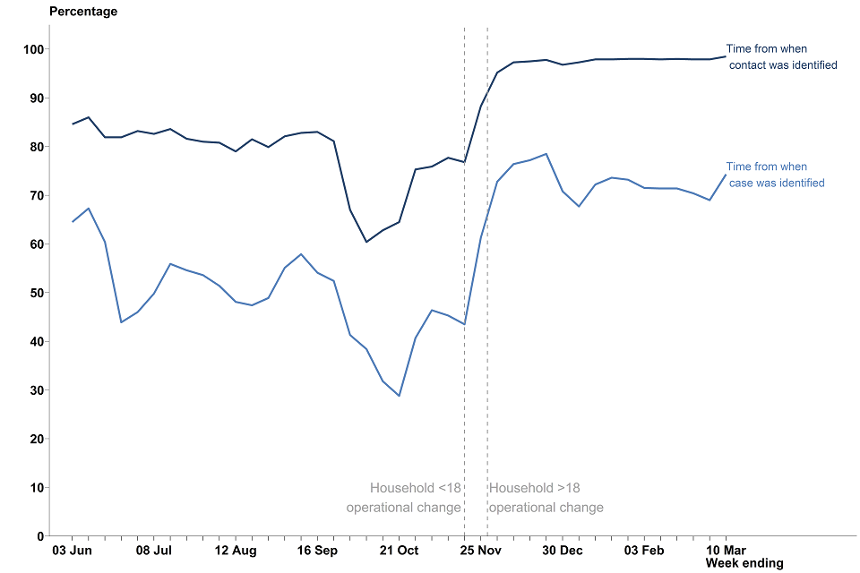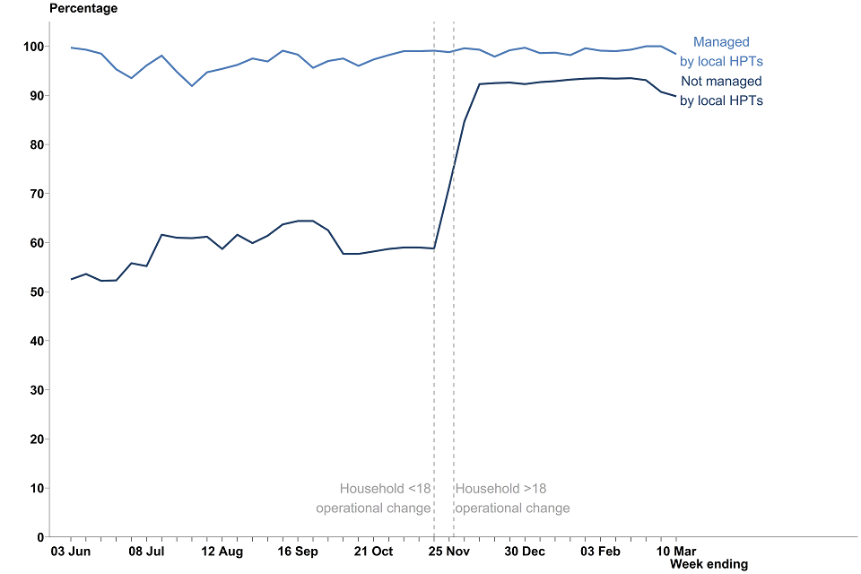 For contacts not managed by local HPTs who were told to self-isolate, 98.5% were reached within 24 hours of being identified. This has remained broadly similar for the last 9 weeks.[footnote 14]