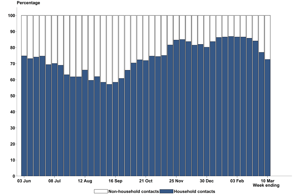 Between 4 March and 10 March 2021, 98.5% of contacts who weren’t managed by local HPTs were reached and told to self-isolate within 24 hours of being identified, consistent with 97.9% the previous week. This percentage has been broadly consistent at around 98% for the last 9 weeks, since the week ending 13 January 2021.