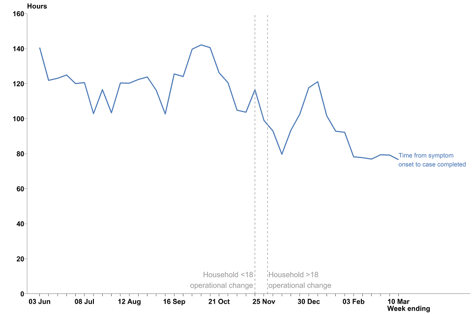 Between late November 2020 and mid December 2020, the median time for contacts that were reached and told to self-isolate decreased before beginning to increase over the Christmas period. Since early January 2021, the median time in hours has decreased overall, and for the past 5 weeks has been at the levels observed at the start of December 2020.