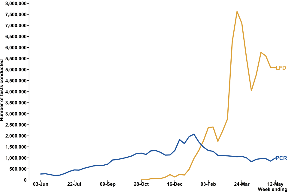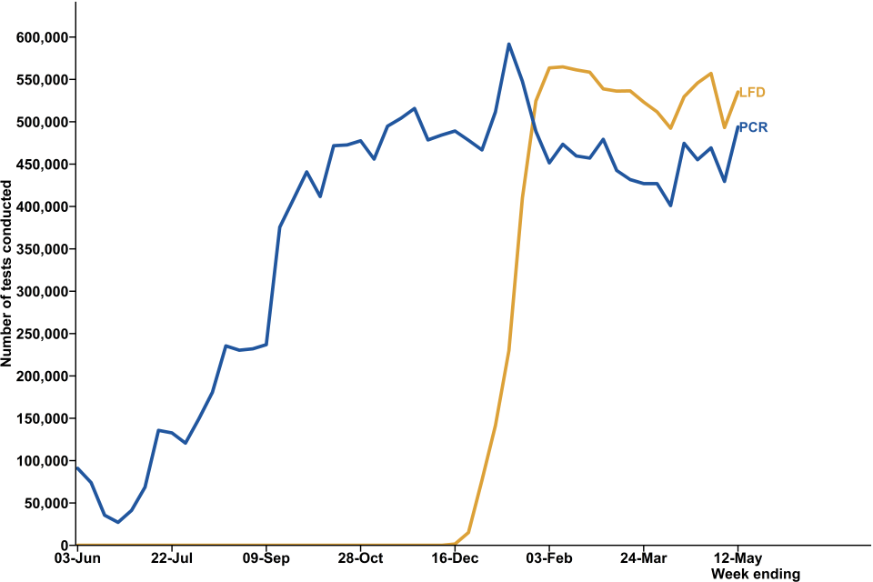 In comparison, 991,086 PCR tests were conducted in the latest week (6 May to 12 May 2021). The number of PCR tests conducted continues to be lower than the number of LFD tests conducted. This reflects the increasing use of LFD tests, as well as a decrease in symptomatic people taking a PCR test due to decreasing COVID-19 prevalence.
