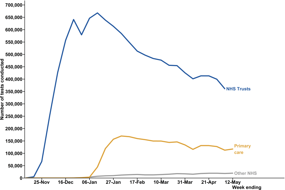 Since their introduction in November 2020, the number of LFD tests reported by staff in NHS trusts rose steeply and peaked at over 660,000 tests in week ending 13 January 2021, dipping only during the Christmas week. Following this the number of tests reported has steadily declined to 361,185 tests in the latest week ending 5 May. Of the tests reported during the latest week, 181 tests were positive which continues the decline in positive test results seen over the past 4 months.