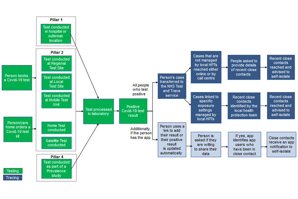 NHS Test and Trace starts with an individual taking a swab test for the virus, either in pillar 1 (testing in hospitals and outbreak locations), pillar 2 (national swab testing) or pillar 4 (prevalence studies). Those who go on to test positive will have their case transferred to NHS Test and Trace for contact tracing.