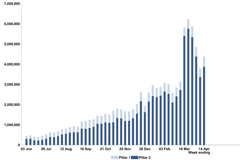 Between 8 April and 14 April 2021, 4,371,670 people were tested for coronavirus (COVID-19) at least once,[footnote 4] a 15% increase compared to the previous week.