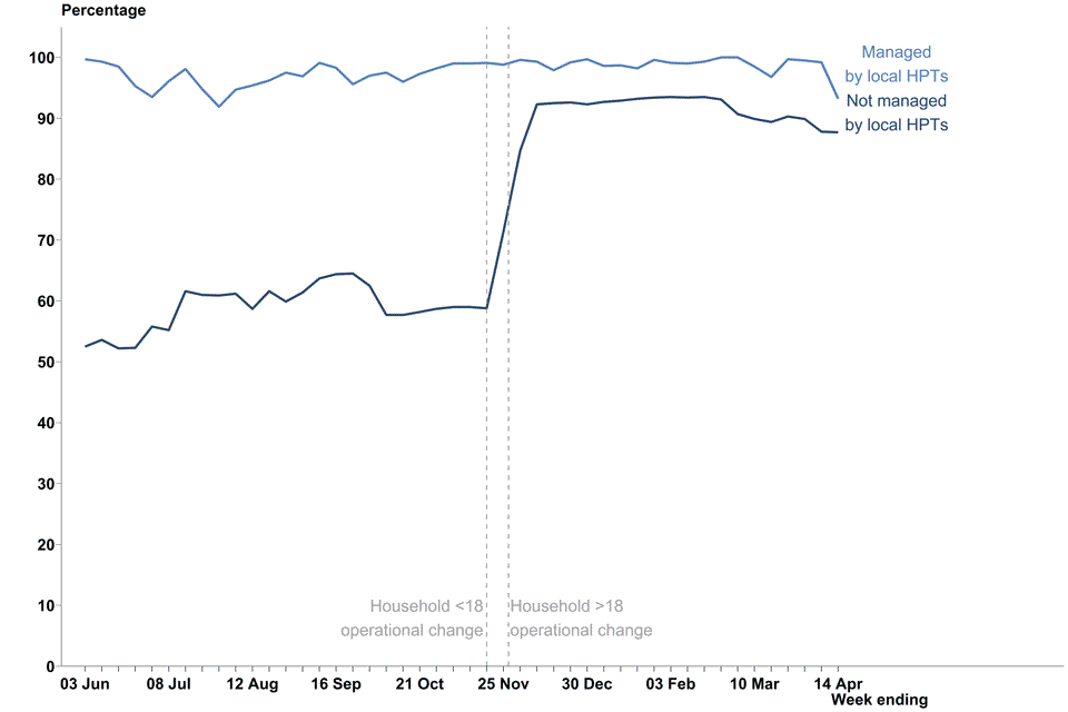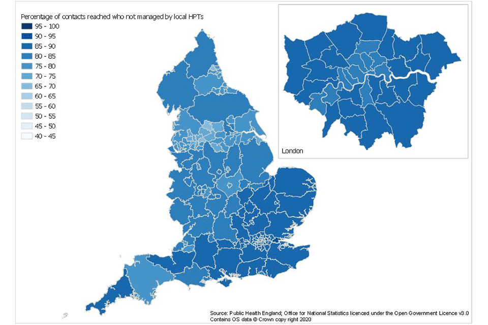 If NHS Test and Trace is not able to reach an individual testing positive or if no communication details are available, then it is not always possible to know if the case should be managed by a local HPT or not. Therefore, these breakdowns are not available. ↩