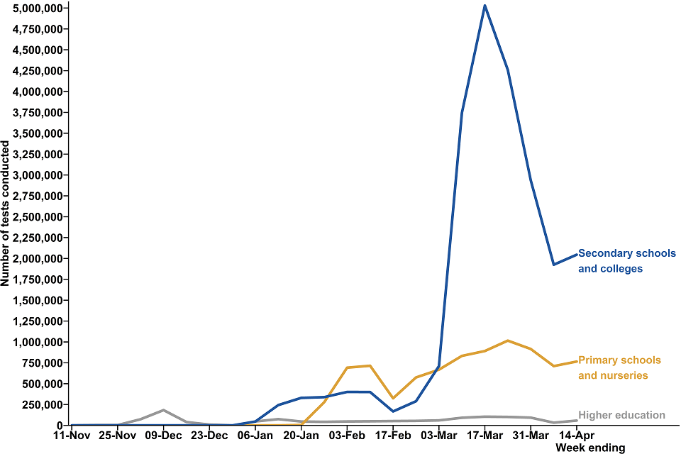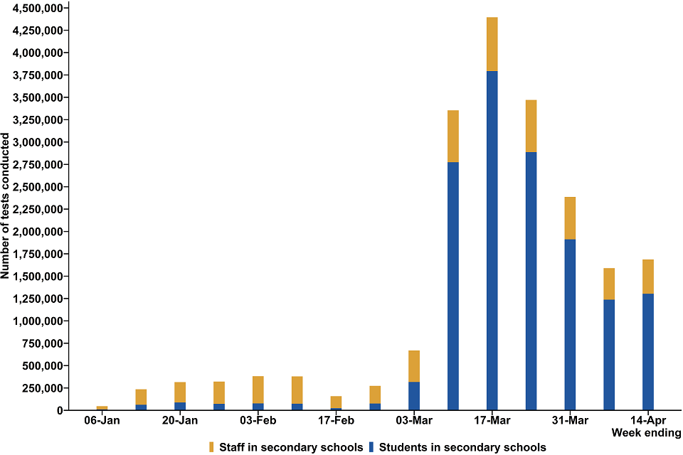 In the latest week ending 14 April, 1,303,509 LFD tests were taken by students in secondary schools which is a slight increase from 1,236,969 tests in the previous week. This increase follows a decrease in tests seen in the previous weeks, this coincides with the Easter holidays and some students returning to school in the latest week.