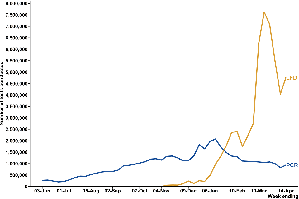 In comparison, 931,979 PCR tests were conducted in the latest week (8 to 14 April 2021). The number of PCR tests conducted continues to be lower than the number of LFD tests conducted. This reflects the increasing use of LFD tests, as well as a decrease in symptomatic people taking a PCR test due to decreasing COVID-19 prevalence.
