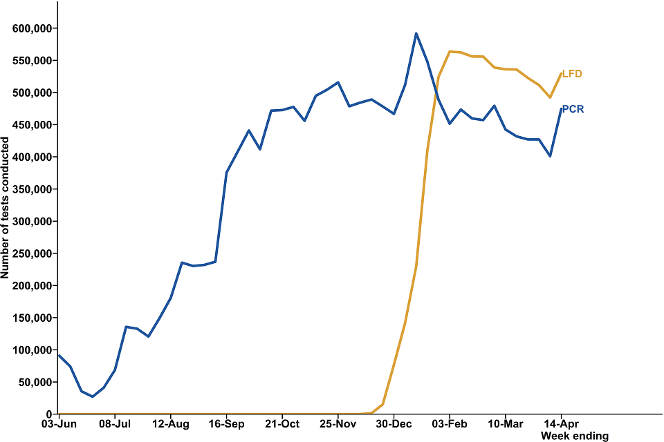 The week commencing 8 April 2021 was the twelfth successive week for which more LFD tests were conducted than PCR tests. Previously the number of PCR tests conducted had always been higher than LFD tests. This reflects the increasing use of LFD tests, as well as a decrease in symptomatic people taking a PCR test due to decreasing COVID-19 prevalence.
