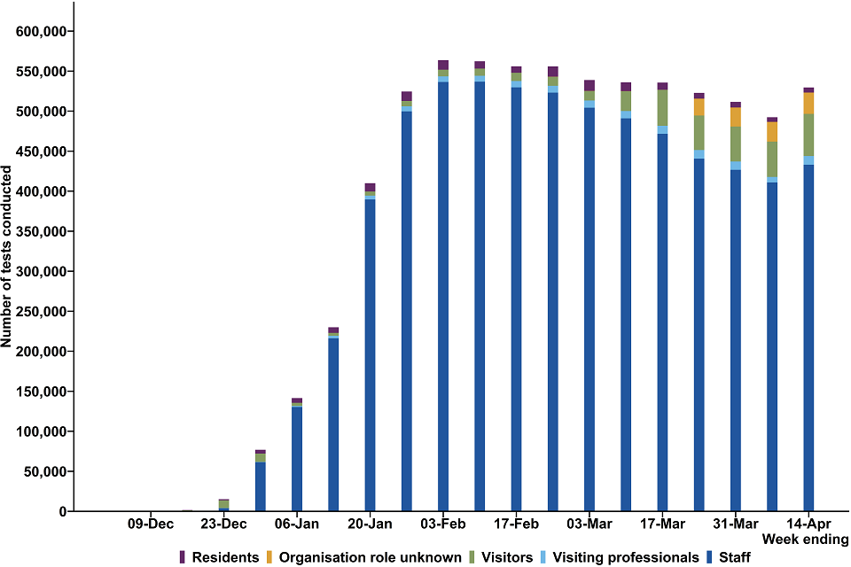 The number of PCR tests conducted within care homes increased overall from 40,000 tests in the week commencing 25 June 2020 to over 550,000 tests in the week commencing 7 January 2021. Following 2 months of decreasing numbers of PCR tests, there has been an increase in the latest week (8 to 14 April) to 474,608, from 401,081 in the previous week (1 to 7 April).