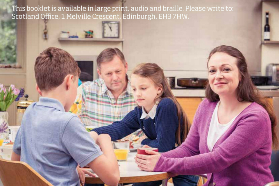 Family sitting round table. Text on image reads: 'This booklet is available in large print audio and Braille. Please write to: Scotland Office, 1 Melville Crescent, Edinburgh, EH3 7HW.'