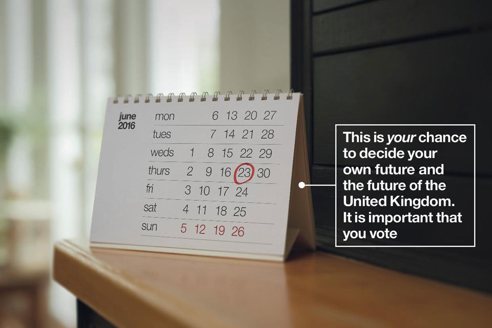 Calendar with 23 June marked. Text on image reads: This is your chance to decide your own future and the future of the UK. It is important that you vote.