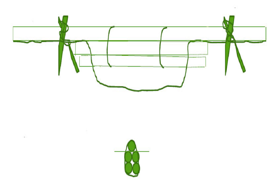 The top 2 logs are secured into place using cross stakes driven into the ground and wired together. Bundle of 7 logs also fixed together with wire.
