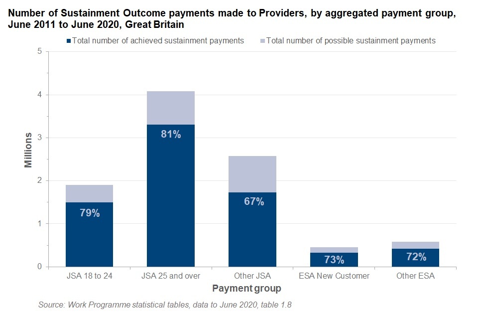 In total, almost 7.3 million Sustainment Outcome payments were paid to Providers, with each payment equating to a participant spending 4 weeks in work after having achieved a Job Outcome. This represents 76% of all Sustainment Outcomes for which participants with Job Outcomes were eligible. Whilst long-term impact cannot be accurately assessed from these statistics, these figures suggest that the majority of participants who achieved the initial Job Outcome criteria went on to remain in work for an extended period.