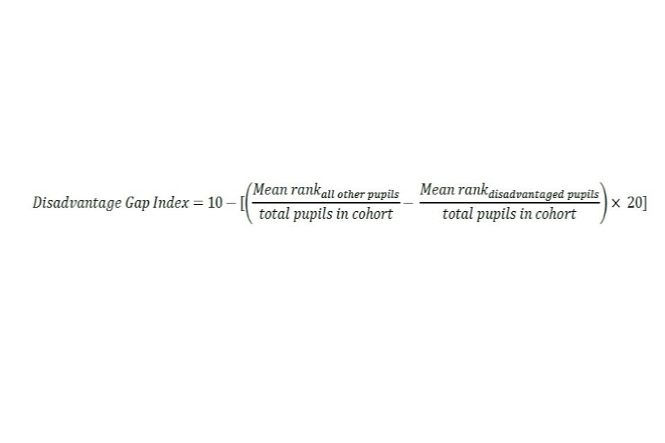 Disadvantage gap index is 10 minus mean rank of all other pupiles divided by total pupils in the cohort minus mean rank of disadvantaged pupils divided by total pupils in cohort, multiplied by 20
