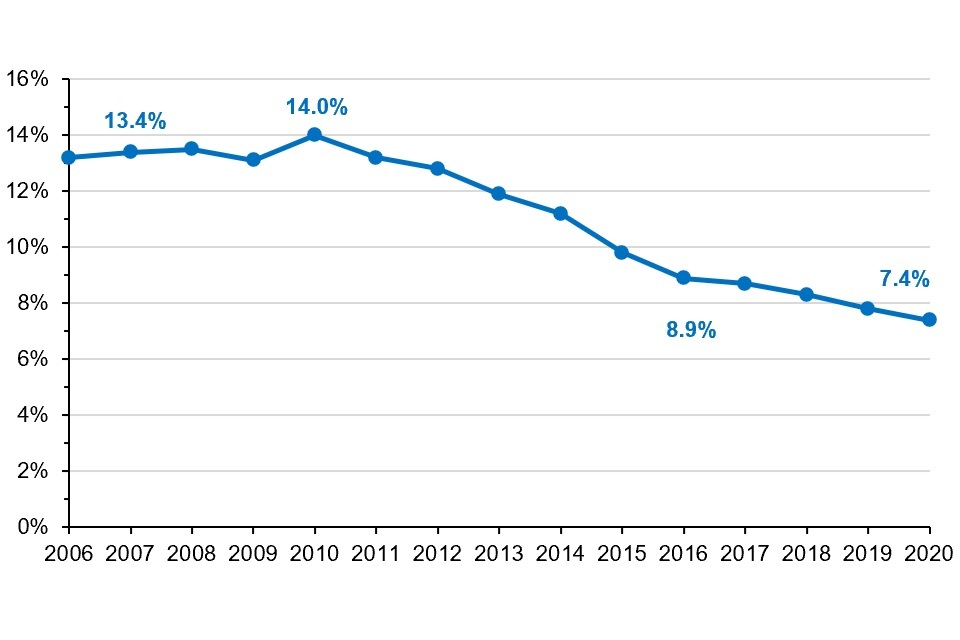 7.4% of all children in England (around 800,000 children) were in long-term workless households in 2020. The measure has continued to decrease since 2010.