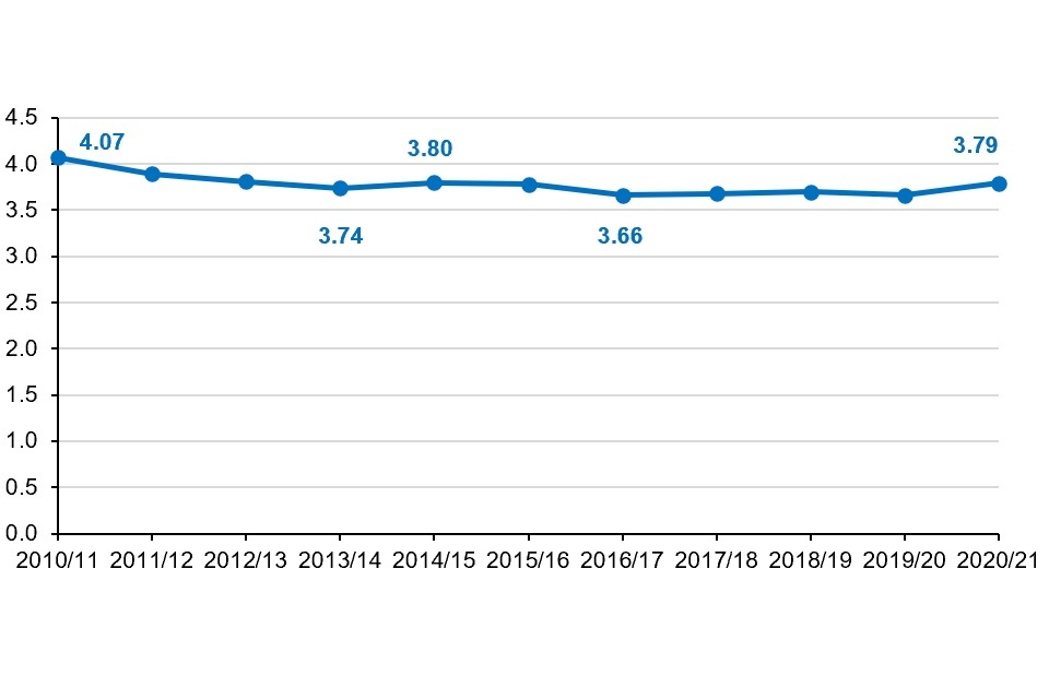 There has been some change in the gap index between 2019/20 and 2020/21; it was 3.66 in 2019/20 and is 3.79 in 2020/21. Since 2010/11 the gap has narrowed.