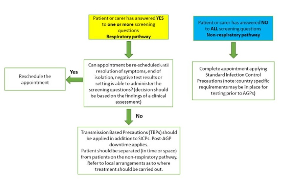 This section summarises the guidance. Refer to the relevant section for further detail. The two pathways are summarised in Figure 1. All patients should be screened for potential COVID-19 infection, ideally prior to attendance at the setting, using the COVID-19 screening questions. An example of COVID-19 screening questions can be found in Appendix 1.