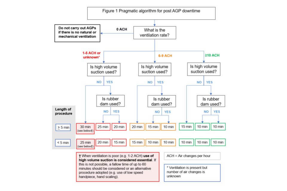 A multidisciplinary working group (the Scottish Dental Clinical Effectiveness Programme, SDCEP) has proposed a pragmatic algorithm with mitigation factors for post AGP downtime that has been accepted by the 4 UK Chief Dental Officers. The SDCEP rapid review of AGPs is available.