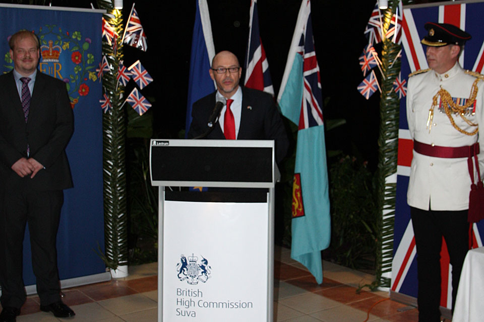 Steven Chandler Acting High Commissioner delivers his speech at the Queen's Birthday Party. Standing on his left is Lieutenant-Colonel Tim Woodman (Wellington-based UK Defence Attaché) and on his right is Dan Salter (Deputy High Commissioner).