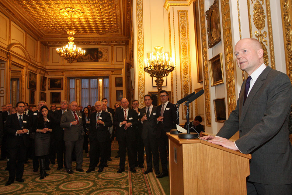 Foreign Secretary William Hague speaking at the EU-US Free Trade Agreement reception in London.